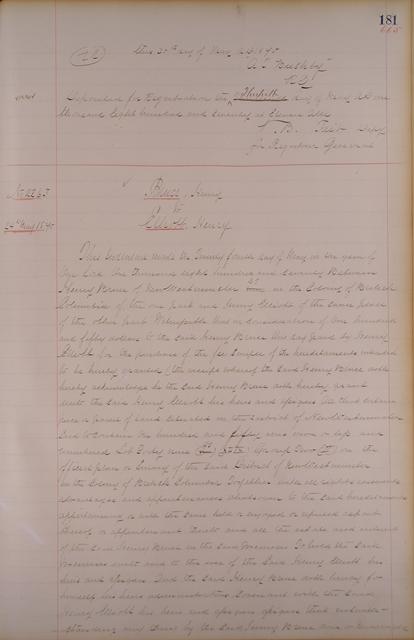 | W, Conveyance Book vol. 2, folios 181 and 182, no. 2263 | 30 May 1870 | On 30 May 1870, the Indenture from Henry Bruce to Henry Elliott, dated 24 May 1870 and conveying certain lands in the District of New Westminster, was deposited for registration at the Land Registry Office. That document explains that Henry Elliott had paid Henry Bruce $150 to purchase 150 acres of land. | 1 |