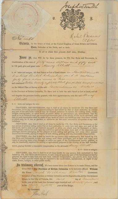 | NW, Crown Grant 15465F | 3 November 1874 | Henry Elliott acquired a further 44 acres in New Westminster District by Crown grant from the provincial Crown dated 3 November 1874. He paid $49.50 for the surface rights, with gold and silver ore explicitly reserved to the Crown. The Crown Grant originally numbered 1463 was signed by Lieutenant-Governor Joseph W. Trutch in the top right-hand corner, by Chief Commissioner of Lands and Works Robert Beaven, beneath the coat of arms, and by Provincial Secretary John Ash at the bottom.