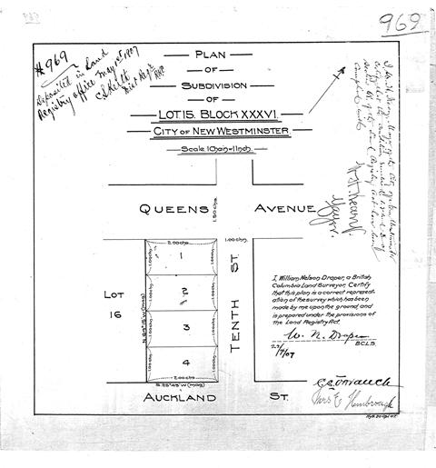 | NW, plan 969 | 1 May 1907 | On 1 May 1907, a plan of the subdivision of Lot 15, Block XXXVI, City of New Westminster, was deposited in the New Westminster Land Registry Office. The plan, showing Lots 1, 2, 3, and 4 on Tenth Street between Queens Avenue and Auckland Street, was certified and signed by British Columbia Land Surveyor William Nelson Draper. New Westminster Mayor W.H. Keary signed the plan to certify that conditions 1, 2, and 3 of section 68 of the Land Registry Act had been complied with. Among the other annotations on the plan is the signature of Mrs. E. Hembrough. | 10 |