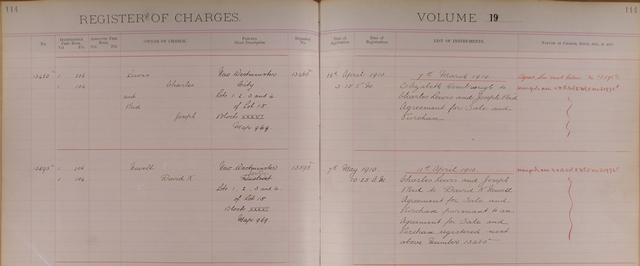 | NW, CB vol. 19, folio 114, no. 13460F | 26 April 1910 | On 26 April 1910, at New Westminster Land Registry Office, Lewis Charles and Joseph Reid were registered as the owners of a charge against Lots 1, 2, 3 and 4 by agreement for sale and purchase dated 7 March 1910 from Elizabeth Hembrough. | 12 |