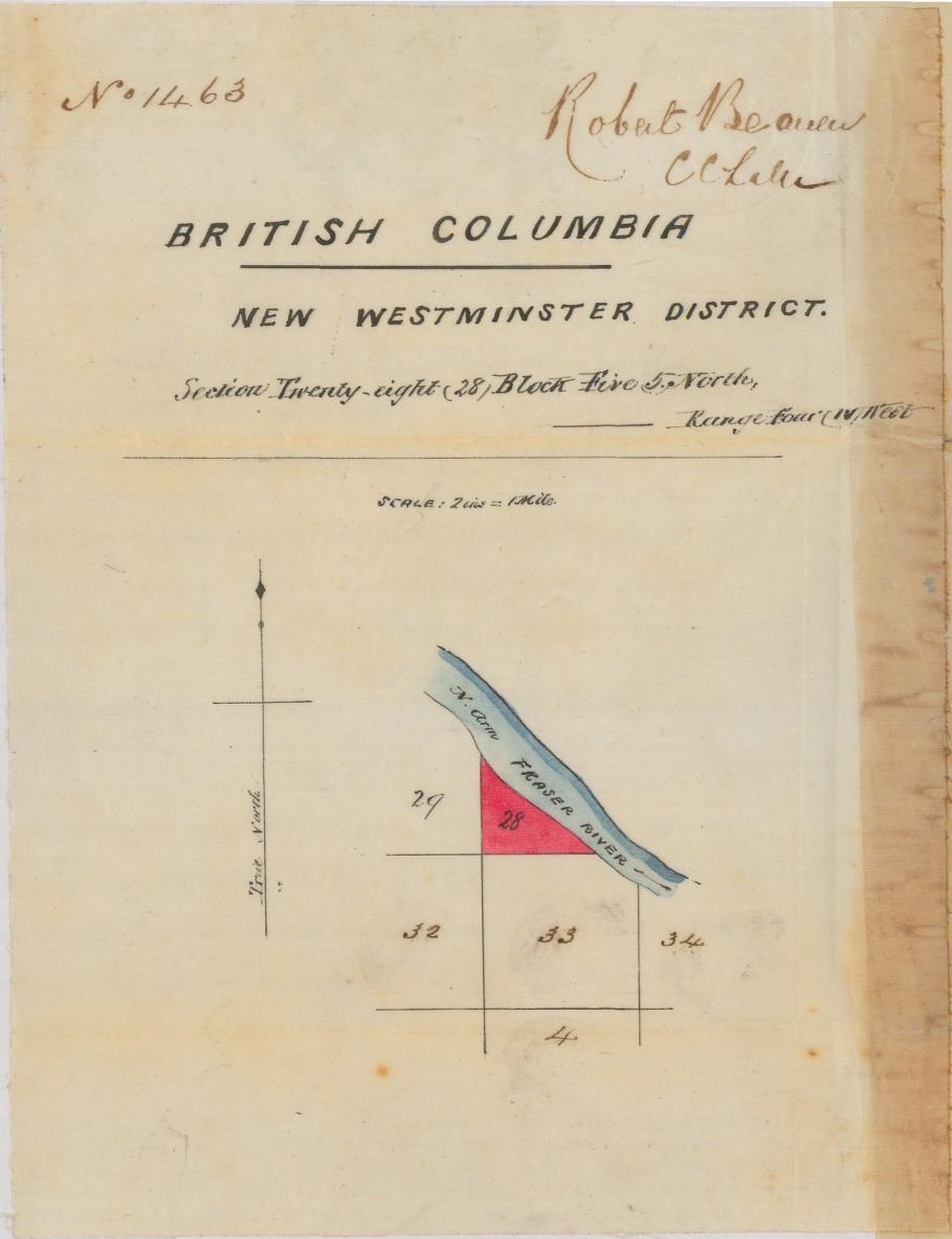 The sketch attached to the Crown grant highlights in red the parcel conveyed to Henry Elliott, showing that Section Twenty-eight (28), Block Five (5) North, Range Four (IV) West, New Westminster District, is along the North Arm of the Fraser River. Again, the sketch is signed Robert Beaven, CCLW.