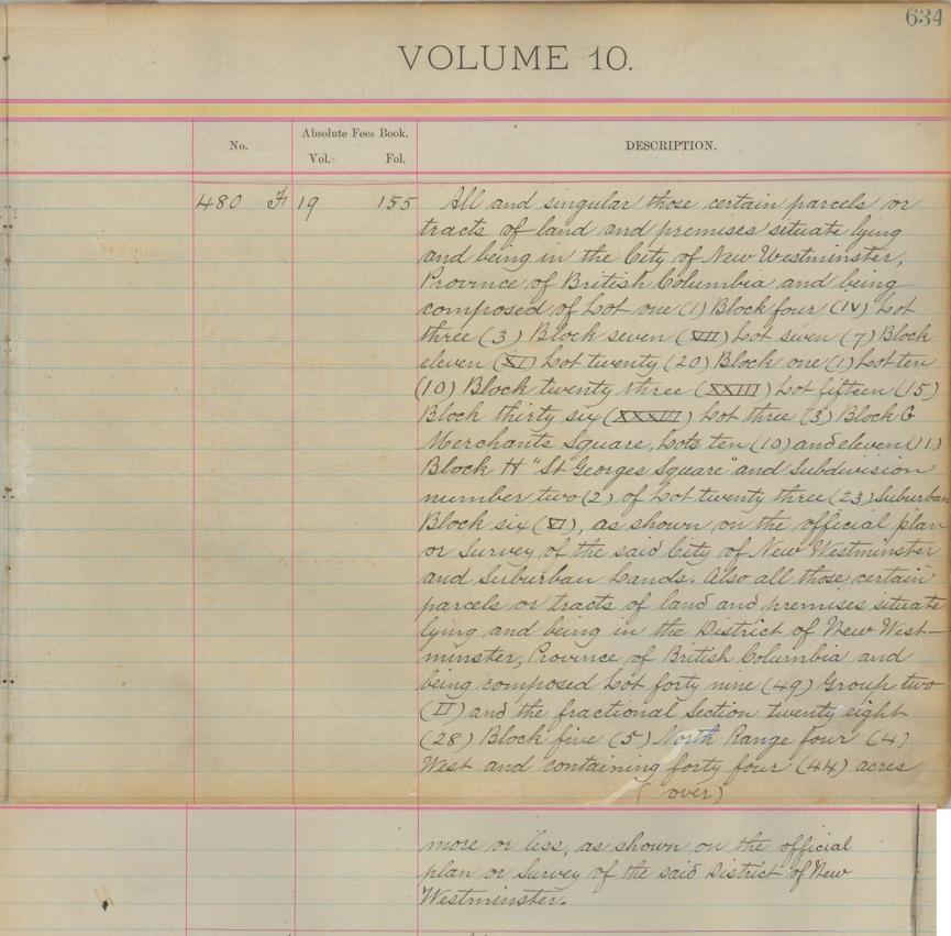 The sketch attached to the Crown grant highlights in red the parcel conveyed to Henry Elliott, showing that Section Twenty-eight (28), Block Five (5) North, Range Four (IV) West, New Westminster District, is along the North Arm of the Fraser River. Again, the sketch is signed Robert Beaven, CCLW. The annotation on the reverse of the Crown grant shows that it was deposited at the Land Registry Office and registered on 14 February 1894 in Absolute Fees Book, volume 19, folio 155 as part of absolute fee 480F. The Crown Grant was just one of the long list of instruments submitted that continued over the page. |